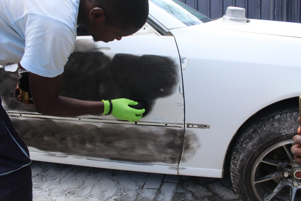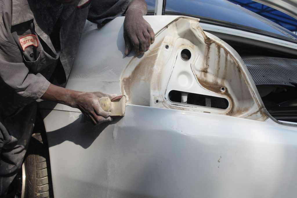 We started the repair works by sanding down to bare metal all the panels with paint wearing. Some parts with small dings were also filled.