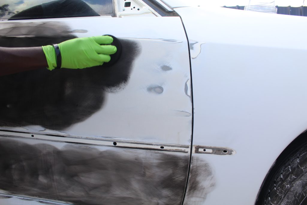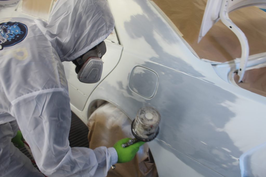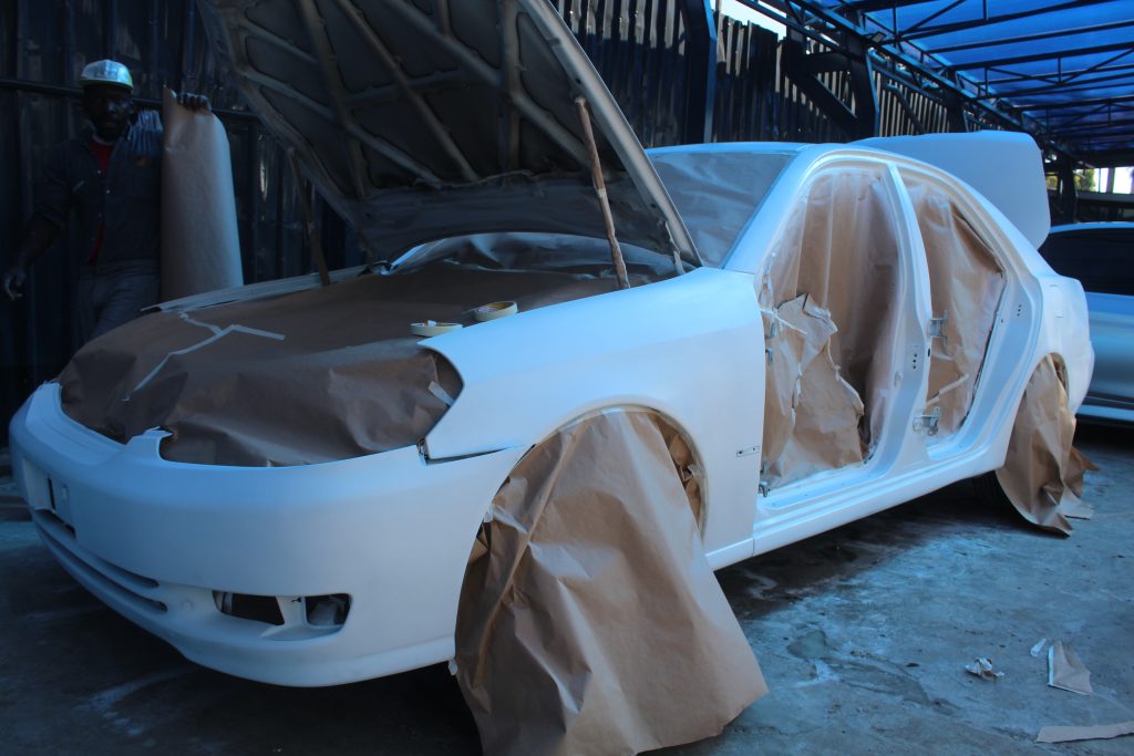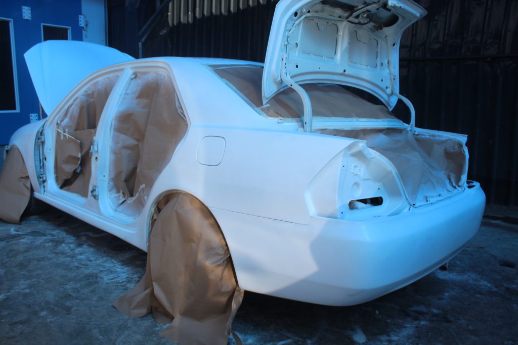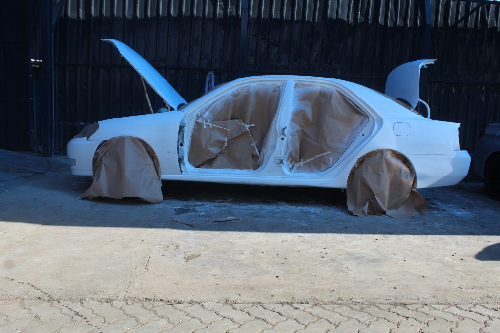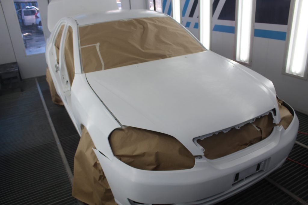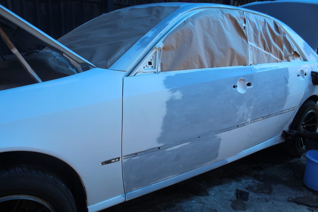 The moment to paint the car had arrived. It was time to infuse the Toyota Mark II with its new vibrant color: Acrtic white. But before we do this, we decided to break the car down into panels. We find it a lot easier to paint this way although we have to do it in two steps.